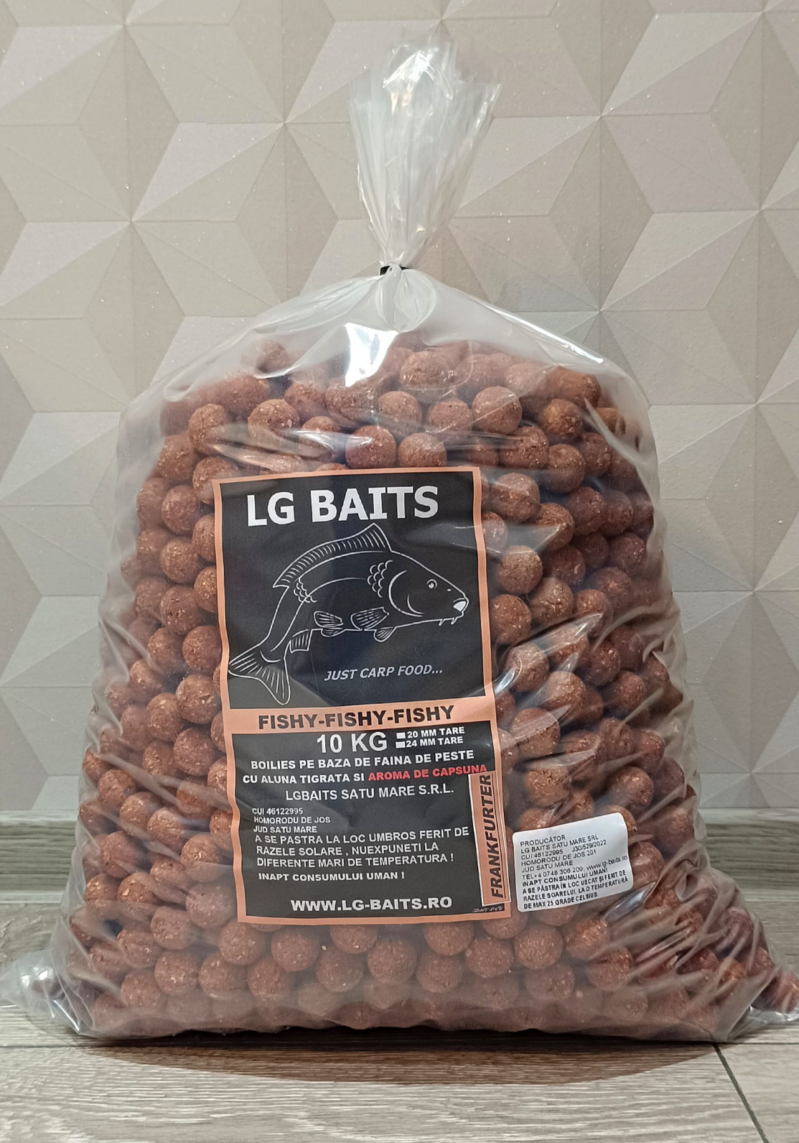 FISHY FISHY FISHY -este un boilies pe baza de faina de peste de calitate cu alună tigrată in doze egale , făra conservanți și fără coloranți , aditivat cu aroma de CAPSUNĂ si o doza considerabila de M17 ( hidroizolat de somon artic ) , aromat cu FRANKFURTER